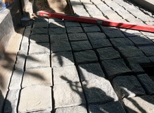 Перед тем, как закладывать участок брусчаткой, мы застелили территорию места захоронения геотекстилем, препятствующим дальнейшему прорастанию травы в швах между плитками.