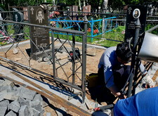 Уложив периметр, мы застелили территорию места захоронения геотекстилем, и выложили брусчатку вокруг памятников, предварительно установив лавочку со столиком.