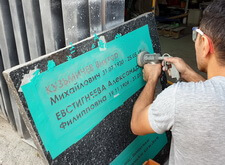 Так выглядело надгробье на момент окончания работ: трафарет остался на памятнике, закрывая отполированное надгробье и свеженанесённую надпись.