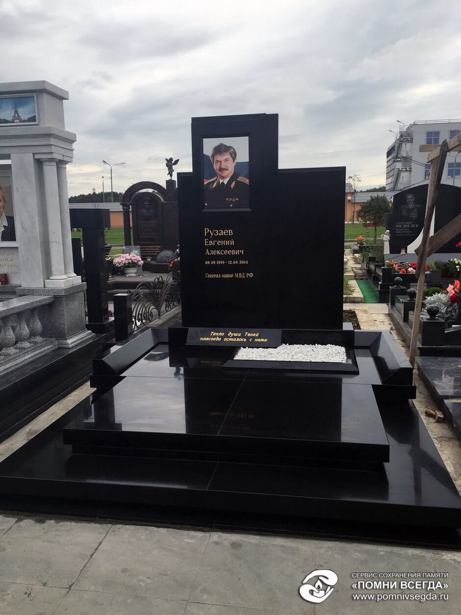 Строгий мемориальный комплекс из черного гранита генерал-майора МВД РФ на Троекуровском кладбище